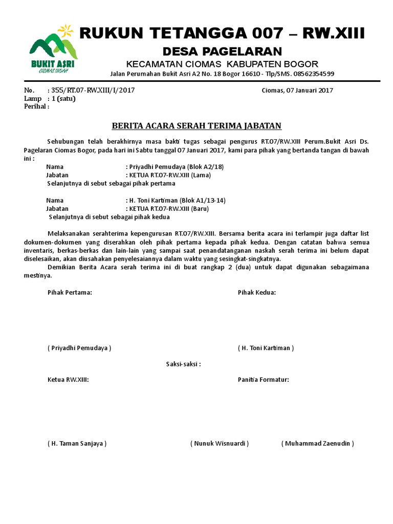 10 contoh surat edaran dengan penulisan yang baik dan. Surat ijin kegiatan rt rw. 9 contoh berita acara rapat kejadian kegiatan kehilangan. Berdasarkan surat keputusan yang dibuat berdasarkan hasil pemilihan umum yang telah diselenggarakan beberapa waktu yang lalu, maka pihak pertama secara resmi menyerahkan jabatannya kepada pihak kedua dan pihak kedua juga telah resmi menerima jabatan yang diberikan. Contoh format surat berita acara pemeriksaan tanah.